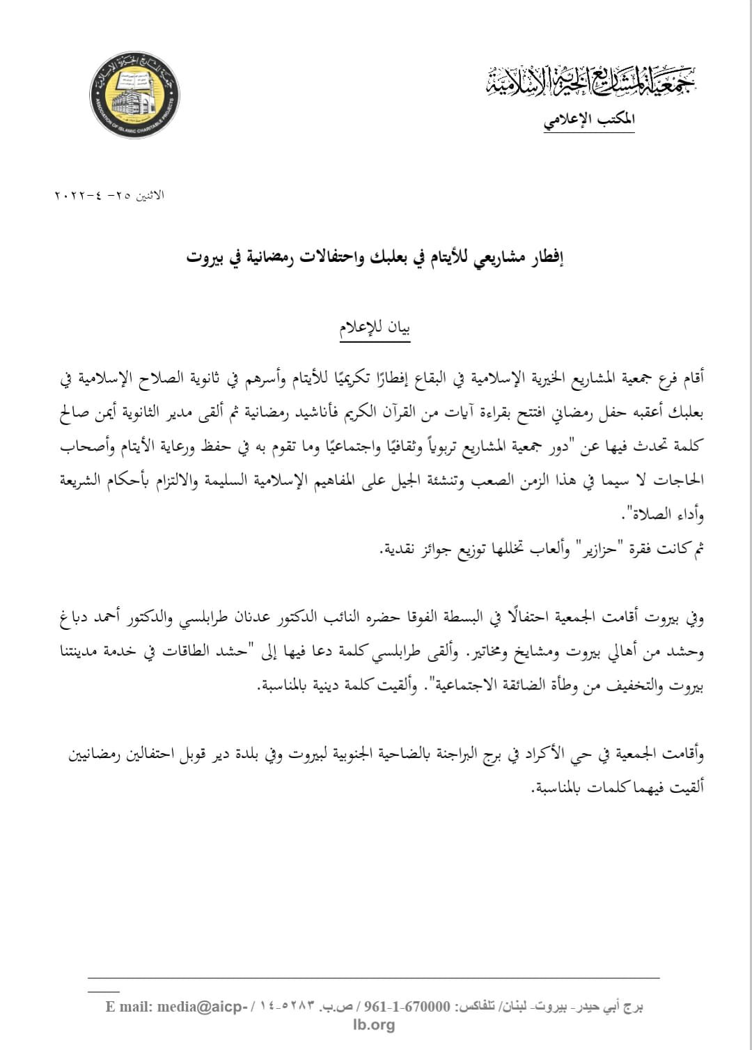 إفطار مشاريعي للأيتام في بعلبك واحتفالات رمضانية في بيروت